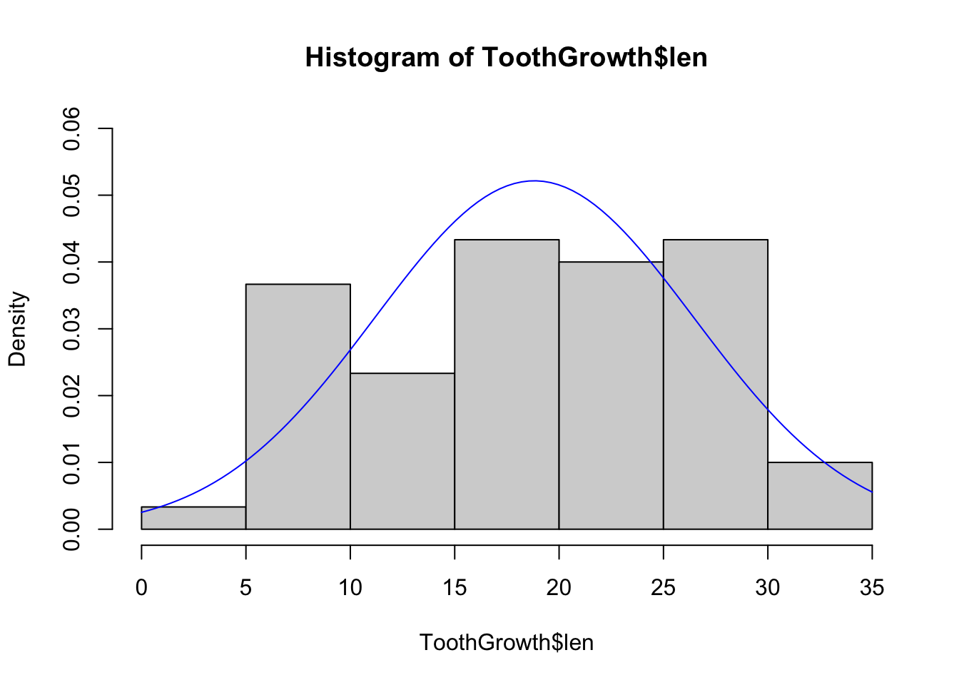 hist(ToothGrowth$len, freq =FALSE, ylim =c(0.00, 0.06))curve(dnorm(x, mean =mean(ToothGrowth$len), sd =sd(ToothGrowth$len)), add =TRUE, col ="blue")