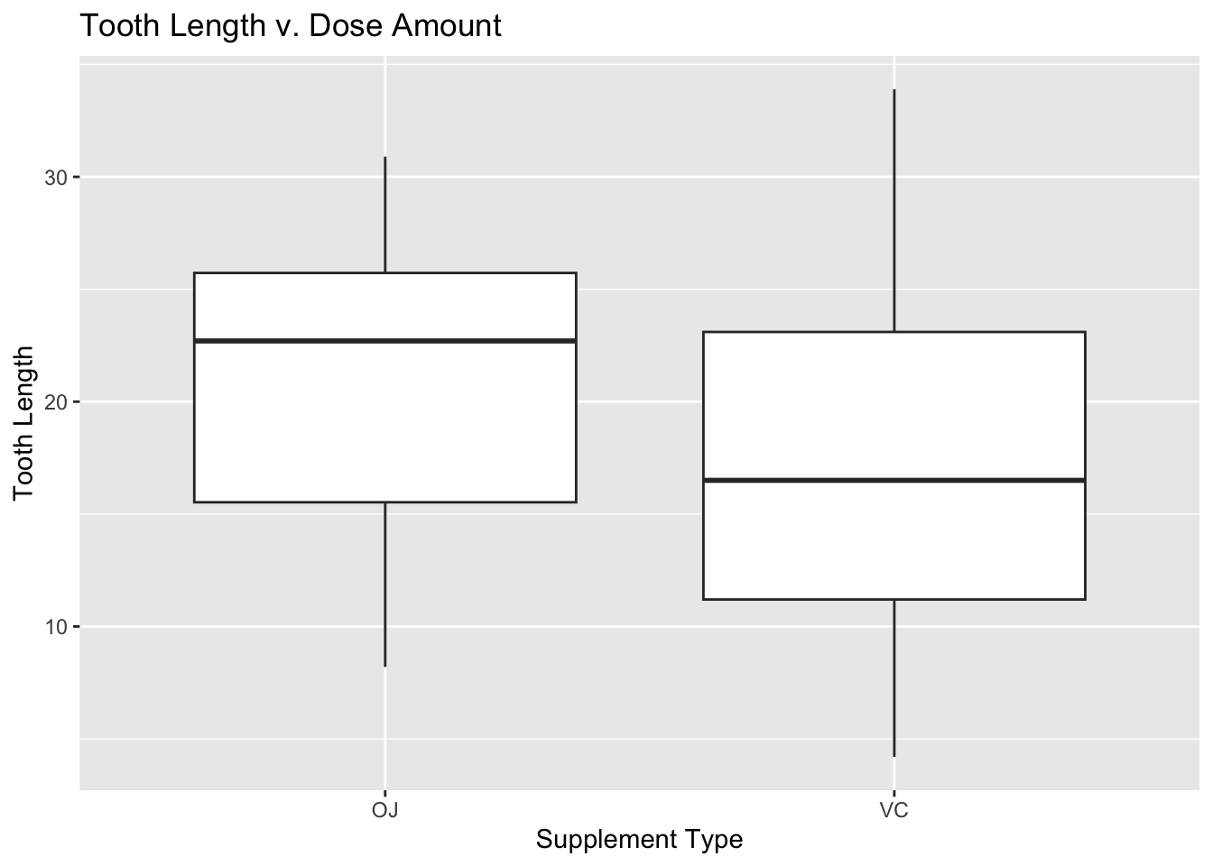 library(ggplot2)ggplot(ToothGrowth, aes(x = supp, y = len)) +geom_boxplot(aes()) +labs(title ="Tooth Length v. Dose Amount", x ="Supplement Type", y ="Tooth Length")