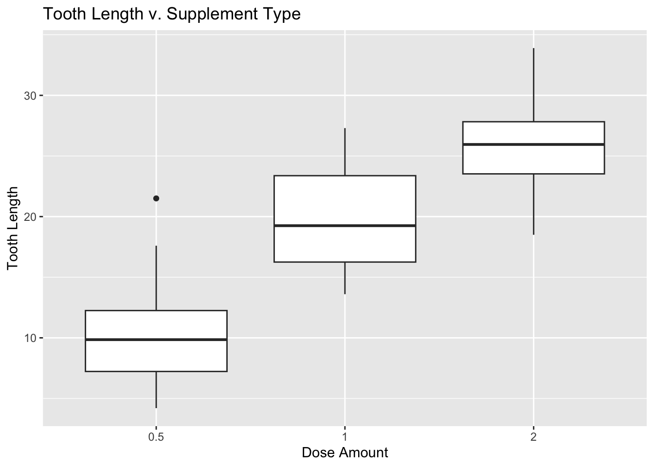 ggplot(ToothGrowth, aes(x = dose, y = len)) +geom_boxplot(aes()) +labs(title ="Tooth Length v. Supplement Type", x ="Dose Amount", y ="Tooth Length")